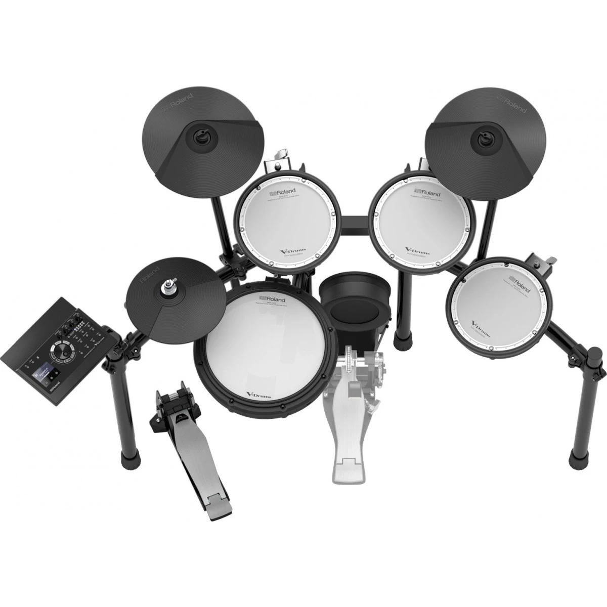 Этот комплект включает модуль TD-17-L, сетчатый малый барабан PDX-8 (двухзонный), три тома с резиновыми пэдами, бас-барабан KD-10, крэш и райд по 8 дюймов, хай-хэт с педалью Roland FD-8, а также стойку для ударных MDS-COM.